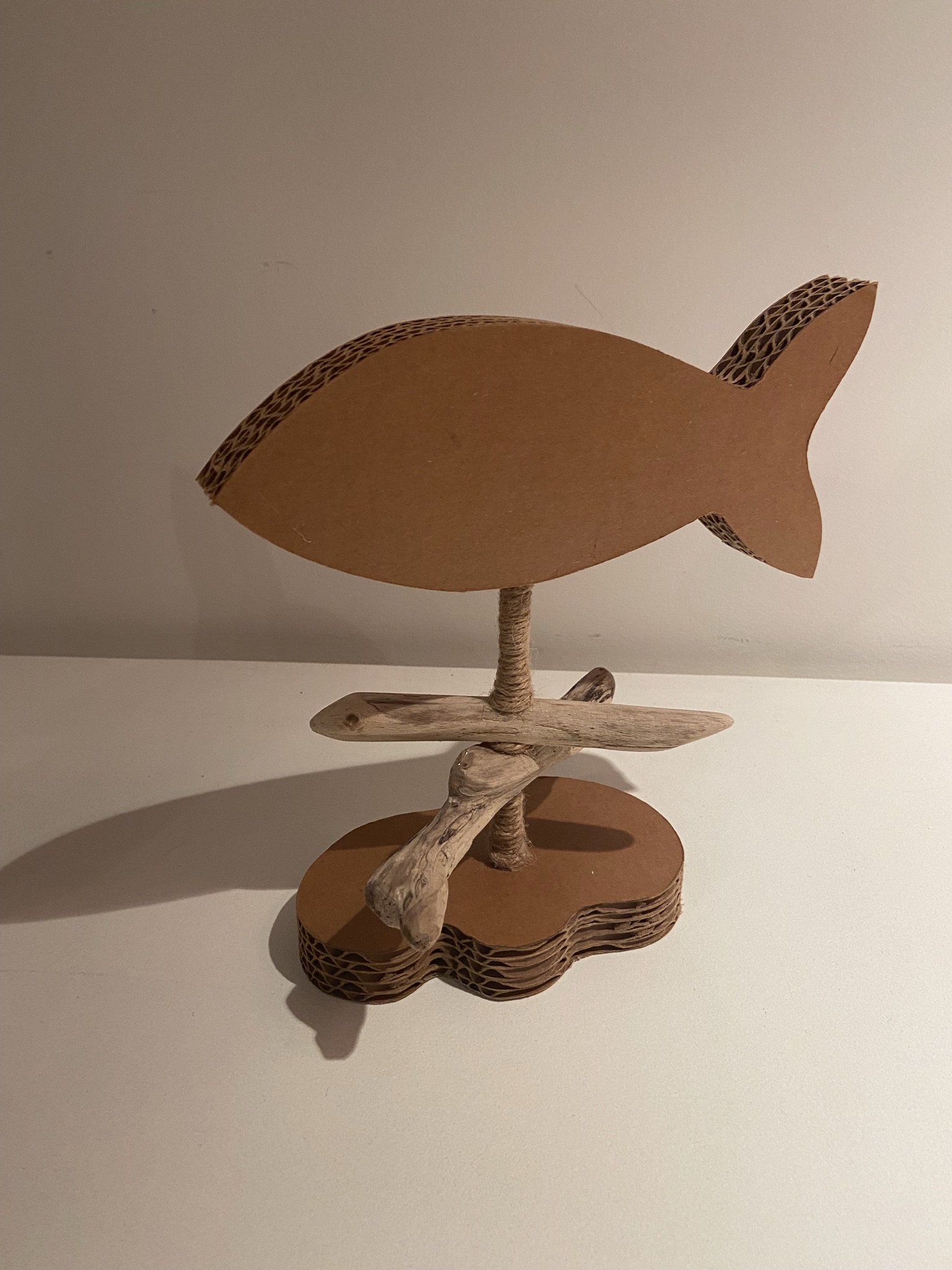 Découpe de poisson en carton recyclé sur tige et socle de support. Environ 20cm*20cm épaisseur 2à3cm