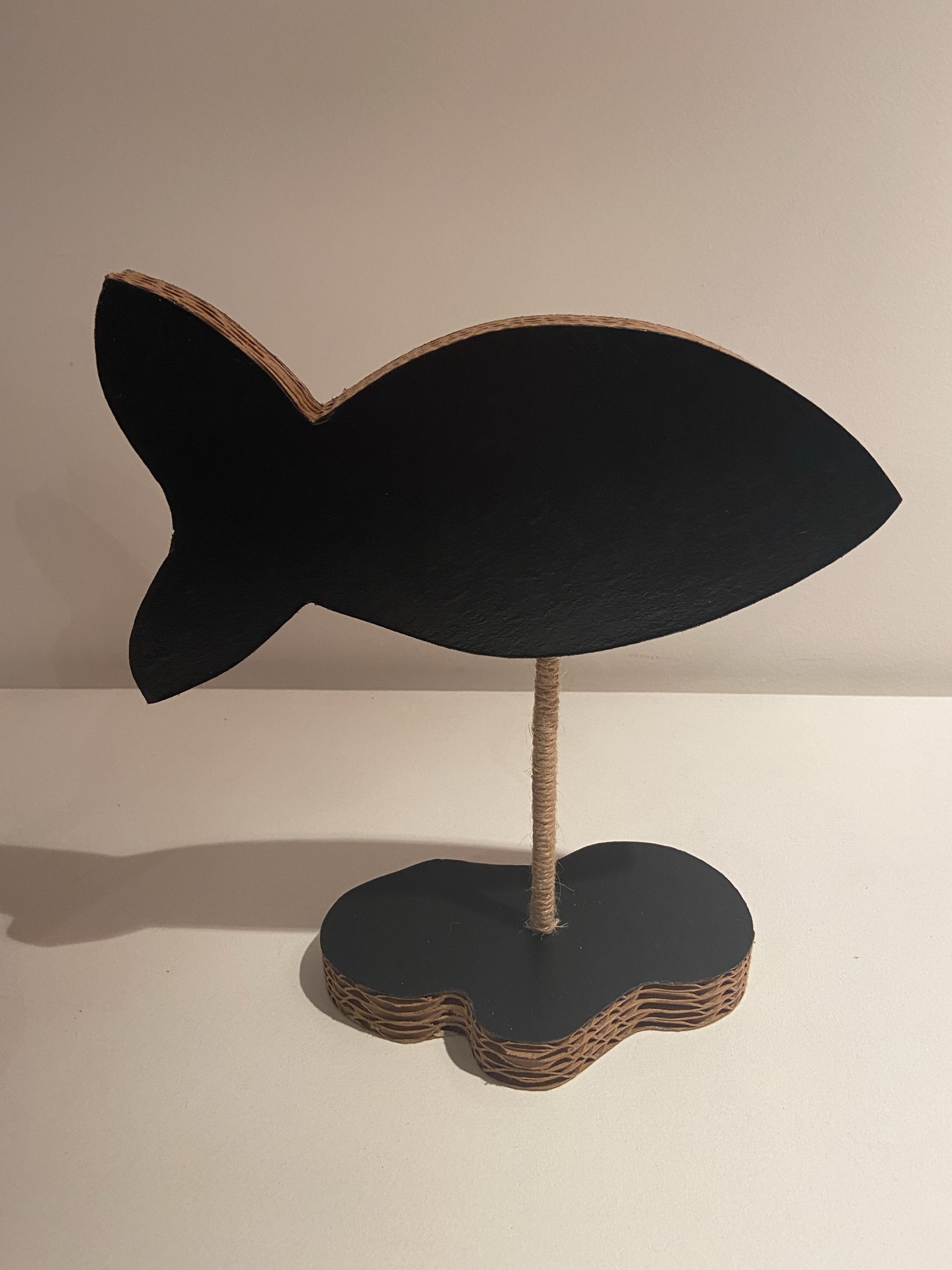 Découpe de poisson en carton recyclé sur tige et socle de support.